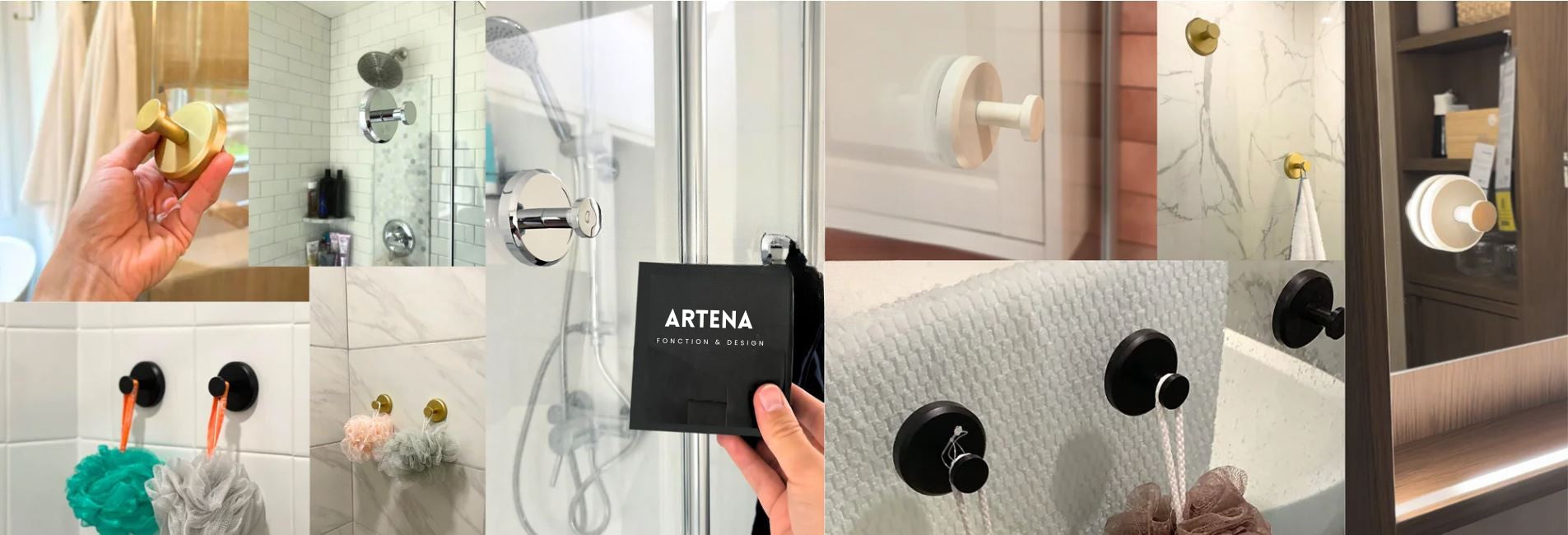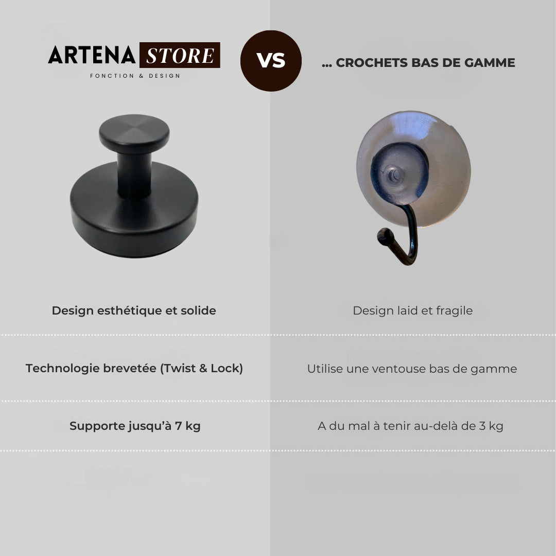 Les crochets à ventouse ARTENA sont conçus pour adhérer parfaitement à toutes les surfaces lisses et non poreuses : verre, carrelage, miroirs, portes de placard, métal, marbre, surfaces stratifiées, etc.