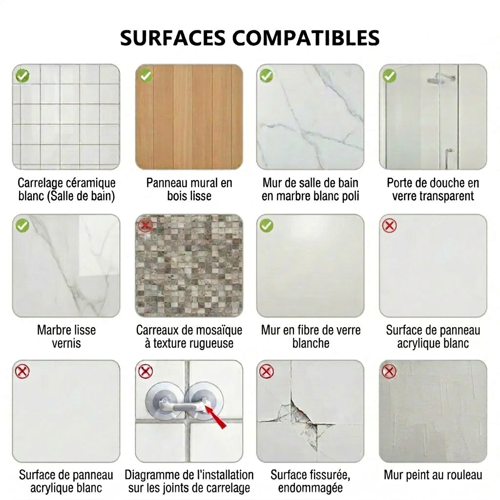 Elle fonctionne sur les surfaces lisses et non poreuses uniquement : carrelage en céramique, verre, acrylique, marbre poli, acier inoxydable, fibre de verre.